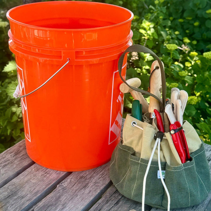 This amazing gardening tool bag is made of heavy, high quality waxed canvas with pockets and space for all your tools and more. It measures 10" W x 6" L has heavy mesh handles for carrying your kit. It has 12 small outside pockets and 6 inside pockets, with a long handle for hanging or removal from the bucket.